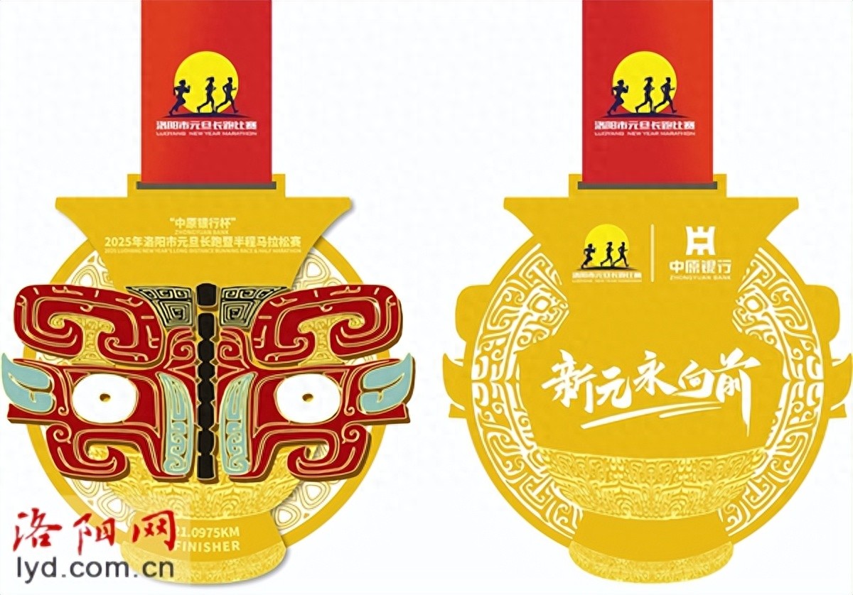 本次賽事的完賽獎牌文化范兒十足。其設(shè)計語言以“新元永向前”為主題,預(yù)示在新年的第一天,以最積極向上的精神面貌迎接新的一年,同時也傳遞了“永不止步”的馬拉松精神。獎牌設(shè)計以洛陽博物館的銅尊和青銅鼎為底樣,正面鑲嵌方鼎獸面紋三彩圖樣,代表了千年古都洛陽濃厚的歷史文化底蘊,讓所有的完賽者都能夠得到一個“最洛陽”的完賽獎勵。