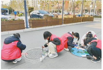 在大學(xué)生志愿者的畫(huà)筆下,藍(lán)天、白云、高鐵、火箭、航天員等生動(dòng)完美地展現(xiàn)在井蓋上,讓平日里“灰頭土臉”的井蓋變成了極具美感的藝術(shù)品,吸引來(lái)往居民駐足觀看。