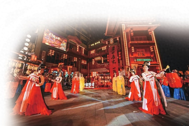 隨著夜幕降臨,一排排古香古色的燈籠瞬間點亮,斑斕的燈火與紅色復(fù)古建筑交相輝映,仿若置身唐宋,一秒夢回千年。