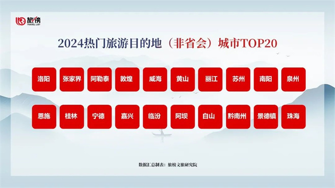 12月17日下午,由旅榜文旅研究院聯(lián)合各地文旅部門、旅游協(xié)會、文旅企業(yè)共同發(fā)起的《2024熱門旅游目的地(非省會)城市TOP20》榜單在杭州發(fā)布。洛陽、張家界、阿勒泰、敦煌、威海、黃山、麗江、蘇州、南陽、泉州、恩施、桂林、寧德、嘉興、臨汾、阿壩、白山、黔南州、景德鎮(zhèn)、珠海20城上榜。