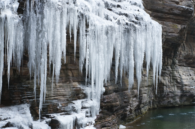 峭壁間的一潭碧水,猶如一顆巨大的綠寶石,鑲嵌在山谷中。只是從巖崖上流下來的水,禁不住凌冽的寒風(fēng)掛滿了長短不齊、大小不一、形狀各異的冰柱,伏在巖崖邊與潭水互訴衷情。