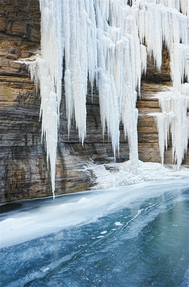 在太行大峽谷幽靜的世界里,冰河,冰掛隨處可見,冰川、冰柱、冰凌,或鑲嵌在高崖之上,或懸掛于峽谷兩側(cè),展現(xiàn)出冬季里壯觀的秀美,仿佛進入了一個冰清玉潔的童話世界。