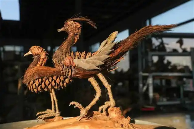 “案子上做的是果殼錦雞,它的原材料很簡單,主要是由大松果、橡子殼、麻繩輔以鐵絲制作而成,顧客非常喜歡,銷路很好。鄉(xiāng)土味的工藝品市場前景很好,行情好的時候一年能賣到30多萬元。”駱彥紅邊做邊說。