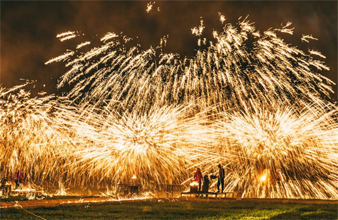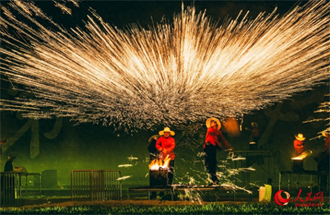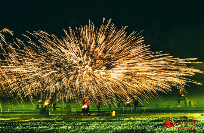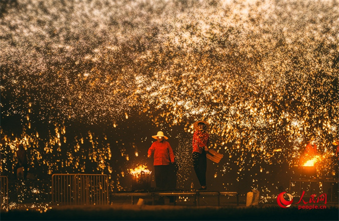 非遺打鐵花表演璀璨上演,為游客帶來了一場震撼的視覺盛宴。人民網(wǎng) 宋芳鑫攝