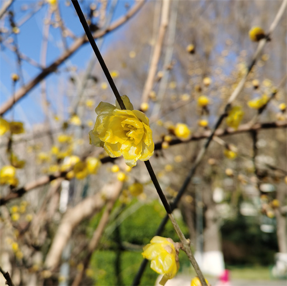 綠陰公園內(nèi)栽植有素心、虎蹄、金鐘、磬口、狗牙等多個品種、900余株蠟梅,或沿公園游路列植,或在綠地內(nèi)片植、叢植,或分布于南門和西北門廣場的主題立體花壇內(nèi)。