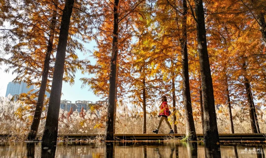 看,東風(fēng)渠生態(tài)文化公園杉樹的葉子,在冬日變成誘人的紅色,與渠中的蘆葦相襯,形成絕美的冬日風(fēng)景。