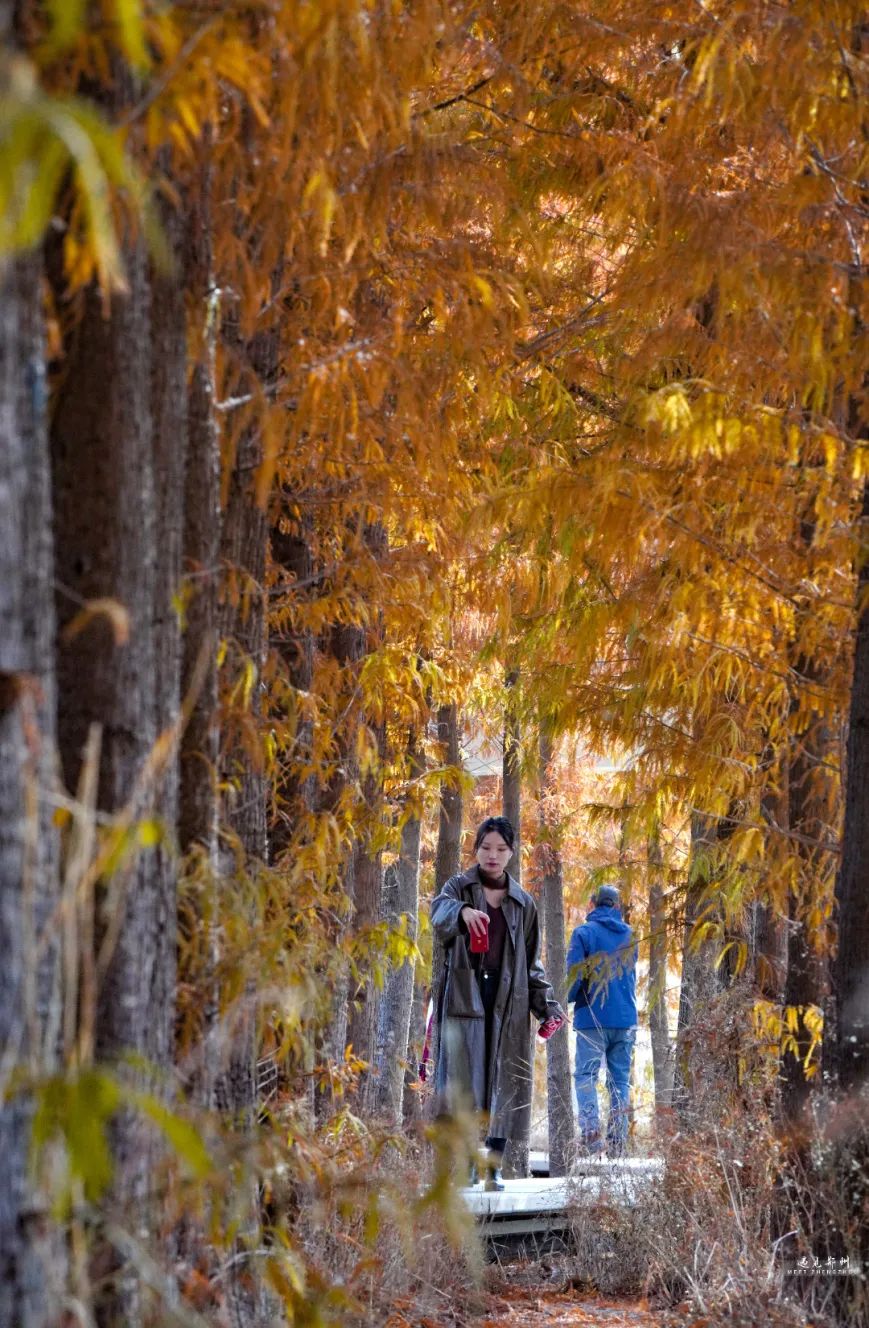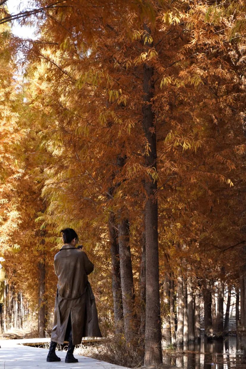 公園內(nèi)的水杉褪去青澀的翠綠襯衣,紛紛套上了美拉德色系的外套,宛如一片燃燒的火焰,照亮冬日的天空。
