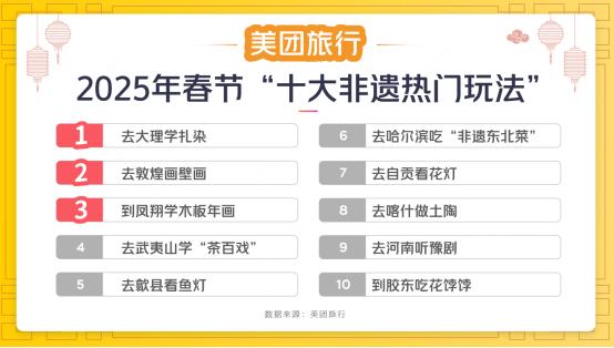 當(dāng)春節(jié)與非遺邂逅,不少消費(fèi)者將“感受非遺”提上春節(jié)日程安排。美團(tuán)旅行根據(jù)網(wǎng)友搜索預(yù)訂量等出爐2025年春節(jié)“十大非遺熱門(mén)玩法”,分別為:去大理學(xué)扎染、去敦煌畫(huà)壁畫(huà)、到鳳翔學(xué)木版年畫(huà)、去武夷山學(xué)做中國(guó)人自己的拉花“茶百戲”、去黃山歙縣看傳統(tǒng)魚(yú)燈、去哈爾濱吃“非遺東北菜”、去自貢看花燈、去新疆喀什做土陶、去老家河南聽(tīng)豫劇、到膠東吃花餑餑。其中,2025年1月1日以來(lái),國(guó)家級(jí)非遺“豫劇”搜索量同比上漲31%。
