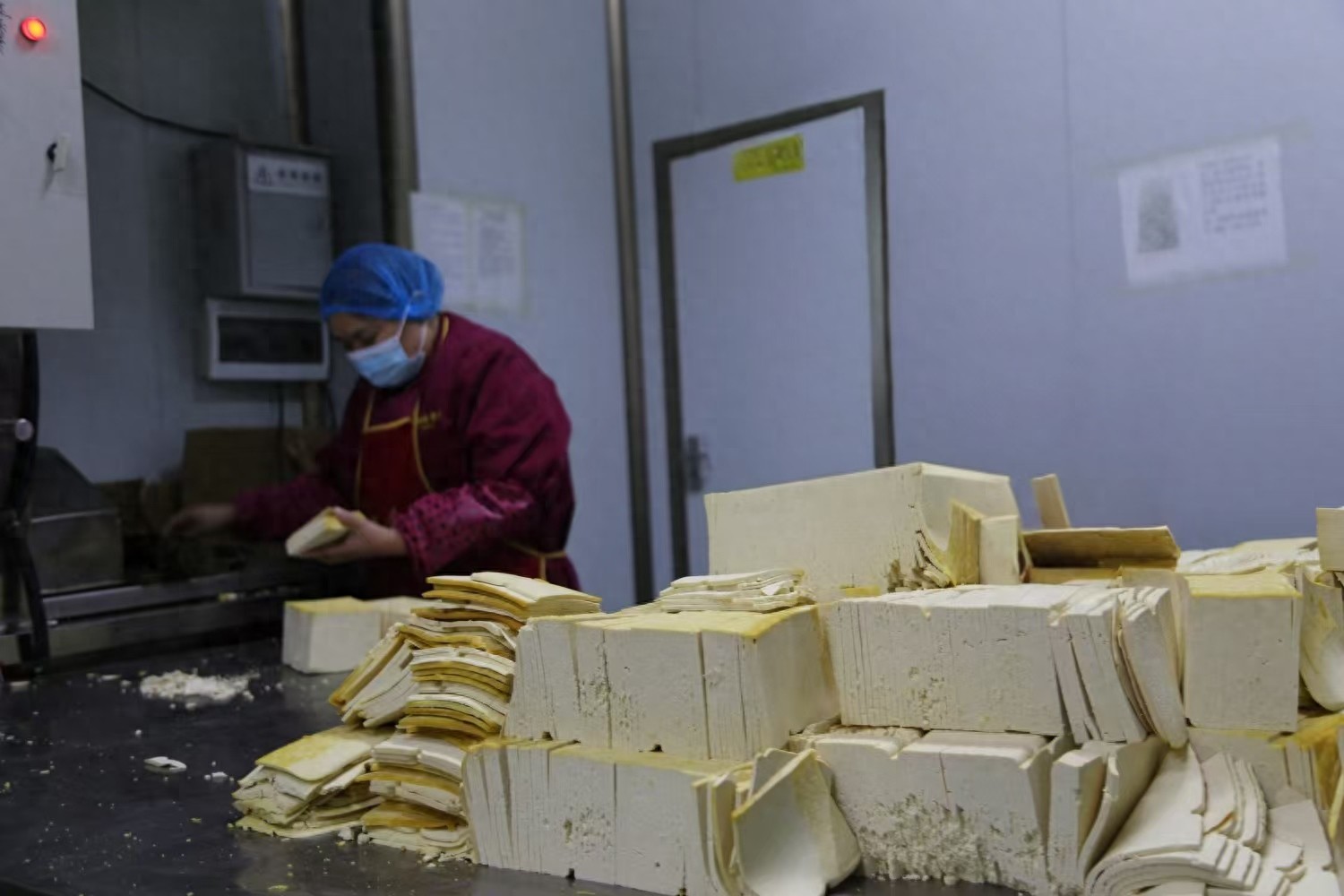 1月11日上午,室外寒氣襲人,而位于郟縣南環(huán)路西段的黃班長食品有限公司卻非常繁忙,豆腐菜生產(chǎn)車間內(nèi),十多名工人在忙著分割豆腐、炸豆腐、切豆腐絲、包裝,生產(chǎn)辣椒油······在隔壁饸饹面生產(chǎn)線,和面、攪拌、壓制、切割,包裝調(diào)料、裝箱,同樣緊張忙碌。