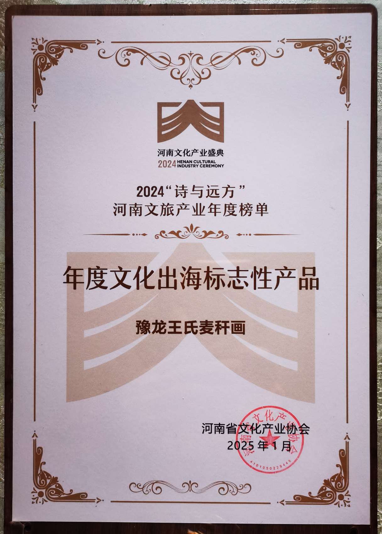 據(jù)悉,會上發(fā)布了“詩與遠方”河南文旅產(chǎn)業(yè)年度榜單,涵蓋熱詞、優(yōu)秀案例、豫匠代表、文化禮品、品牌推廣、營銷事件、文化品牌IP、出海產(chǎn)品等,全面展現(xiàn)了河南文旅產(chǎn)業(yè)過去一年的創(chuàng)新與發(fā)展成果。濮陽市豫龍麥稈藝術發(fā)展有限公司的王氏麥稈畫憑借其深厚的歷史底蘊、精湛的藝術技藝和廣泛的國際影響力,獲評“河南省年度文化出海標志性產(chǎn)品”。