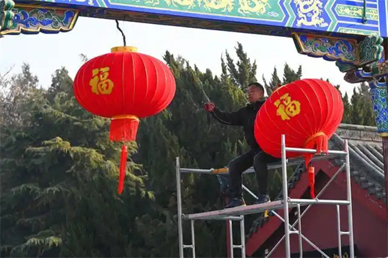 1月20日,開(kāi)封市翰園碑林景區(qū),工人正在懸掛紅燈籠。