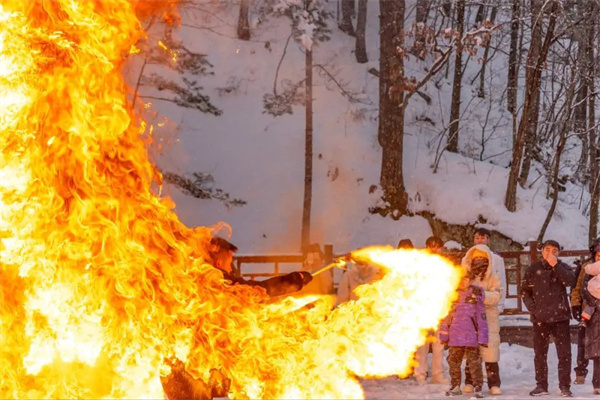 白云湖嬉雪處每日兩場(chǎng)火技表演