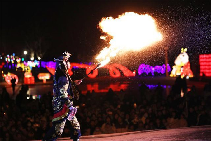 1月31日晚,溫縣陳家溝景區(qū)燈火輝煌,造型各異的花燈將夜空裝點(diǎn)得絢麗多姿,流光溢彩。游客們紛至沓來,賞花燈、品美食、賞民俗,沉浸在濃濃的年味中。民間藝人們?cè)诰皡^(qū)內(nèi)大顯身手,噴火節(jié)目驚險(xiǎn)刺激,火壺表演技藝高超,引得游客們陣陣喝彩。一盞盞精美的花燈下,游客們或駐足欣賞,或拍照留念,歡聲笑語不斷。