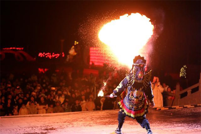 民間藝人在溫縣陳家溝景區(qū)表演噴火節(jié)目。