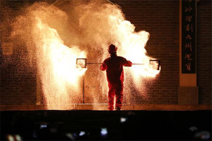 民間藝人在溫縣陳家溝景區(qū)進(jìn)行火壺表演。