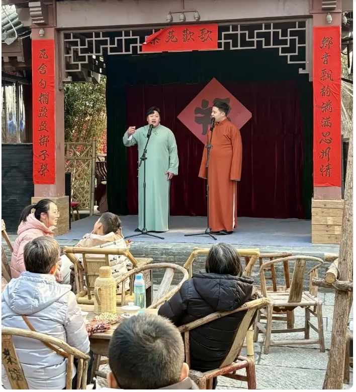 茶香未散,茶館內(nèi)的表演已鑼鼓開場——相聲演員妙語連珠,逗得滿堂喝彩;快板聲清脆如雨,傳統(tǒng)曲藝輪番登場,茶館秒變“戲園子”。而在茶館一角,幾位年輕人早已支起麻將桌,“碰!”“該你了!”的吆喝聲此起彼伏,市井煙火氣十足。