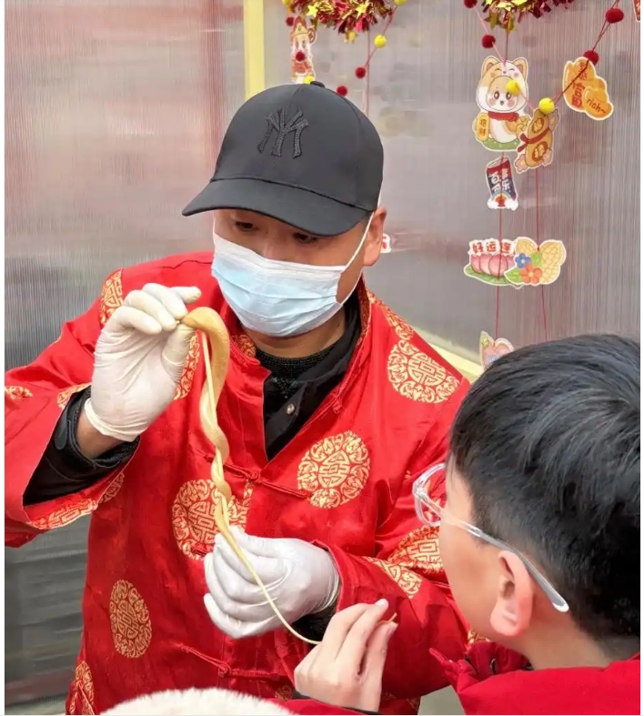 不少路過的小朋友們興奮地喊著:“要一個蛇!” “要一個小羊!”圍觀的家長則忙著回憶自己兒時對吹糖人的記憶,欣然掏腰包,讓孩子們也親身體驗這份傳統(tǒng)技藝的魅力。一正在排隊的家長告訴頂端新聞記者:“小時候過年吹糖人還會邊吹邊唱,我買來是送給孩子的,當(dāng)作特別的新年禮物。”