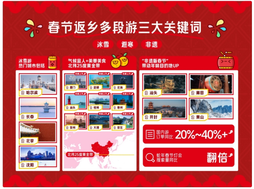 2025年春節(jié),河南文旅市場在非遺文化、冰雪旅游和入境游的多重推動下,迎來了前所未有的火爆局面。攜程發(fā)布的《2025年春節(jié)旅游總結(jié)報告》顯示,河南多個城市在全國春節(jié)旅游熱門目的地排名中表現(xiàn)突出,其中開封更是成為年味目的地全國排名第一的城市,鄭州和洛陽也分別在冰雪游和入境游方面取得了顯著成績,河南成為全國春節(jié)旅游市場的熱門省份之一。