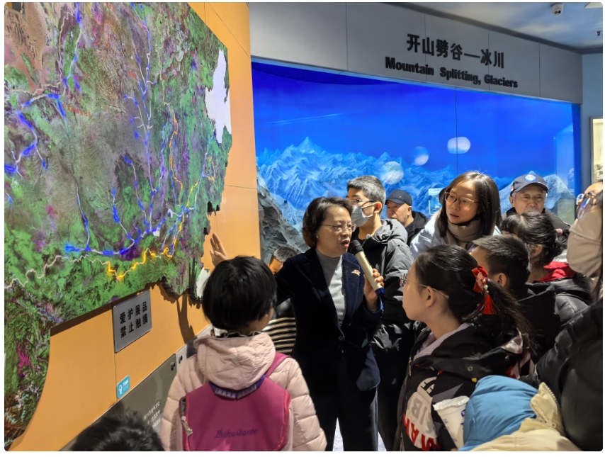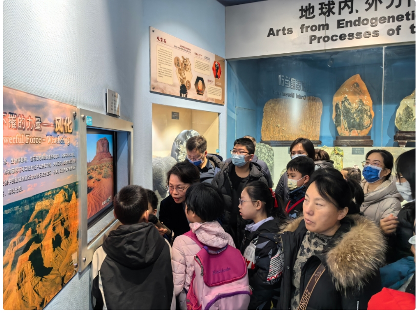 地球廳展示了地球誕生之后的演化歷程,包括宇宙的奧秘、地球的圈層結(jié)構(gòu)、地質(zhì)作用以及各種巖石、地貌的形成等。上午10點(diǎn),徐館長(zhǎng)從太陽(yáng)系的八大行星開始講起,深入淺出地為觀眾們揭示了地球和各行星之間的關(guān)系。講解過程中,她結(jié)合展廳內(nèi)的各種展品和模型,如太陽(yáng)系的八大行星、大陸漂移、喀斯特地貌、冰川作用等,生動(dòng)地講解了地球的演化過程以及地質(zhì)作用對(duì)人類生活的影響。她還特別提到了黃河、黃土和黃河文化,強(qiáng)調(diào)了河南地區(qū)在地質(zhì)和文化上的獨(dú)特地位,呼吁大家要珍惜和保護(hù)我們賴以生存的地球環(huán)境,為保護(hù)生態(tài)積極行動(dòng),共同守護(hù)好我們的家園。