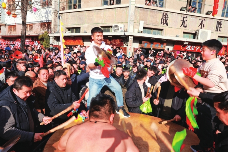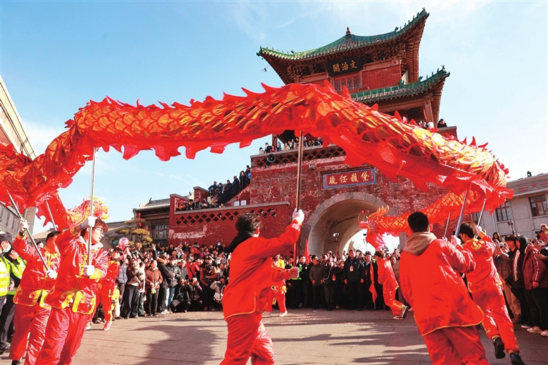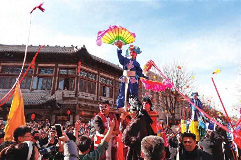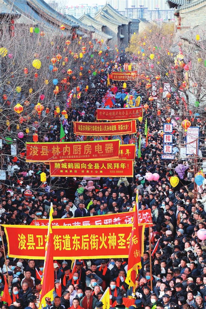 2月12日,農(nóng)歷正月十五元宵節(jié),?h古城文治閣前鑼鼓震天,社火巡游隊伍如長龍蜿蜒。