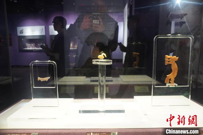 2024年5月,河南三門峽,游客在虢國博物館拍攝“玉鵝”。“玉鵝”左側(cè)是雙人紋玉獸,右側(cè)是玉鳳。中新社記者 韓章云 攝