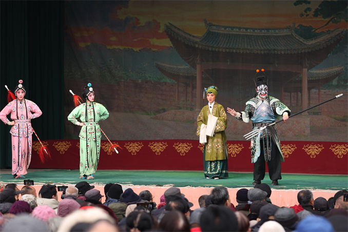 舞臺(tái)上,身著華麗戲服的演員們,時(shí)而高唱,時(shí)而打斗,時(shí)而追逐,時(shí)而蹦跳……強(qiáng)烈的節(jié)奏,響亮的板鼓,激越的梆子,高亢的唱腔,引得不少群眾拿出手機(jī),或開(kāi)直播,或錄視頻,或拍照片。