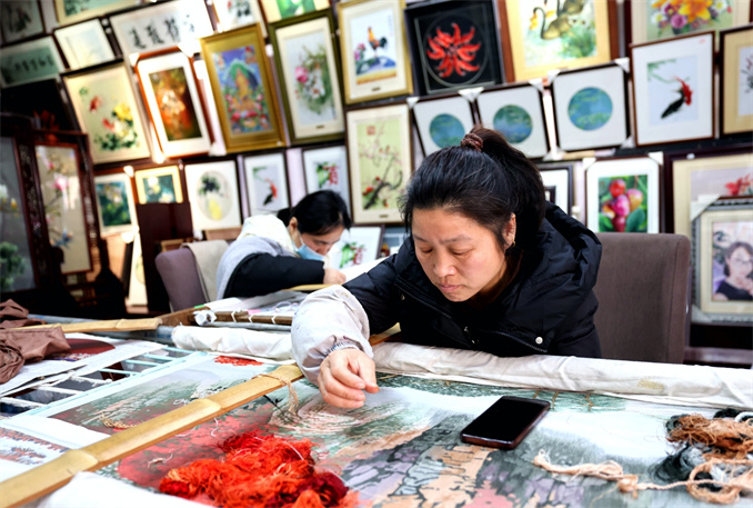 員工正在認(rèn)真地制作“安繡”作品。
