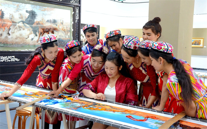 “安繡”創(chuàng)始人馮榮麗在向維吾爾族姑娘傳授安繡技法。