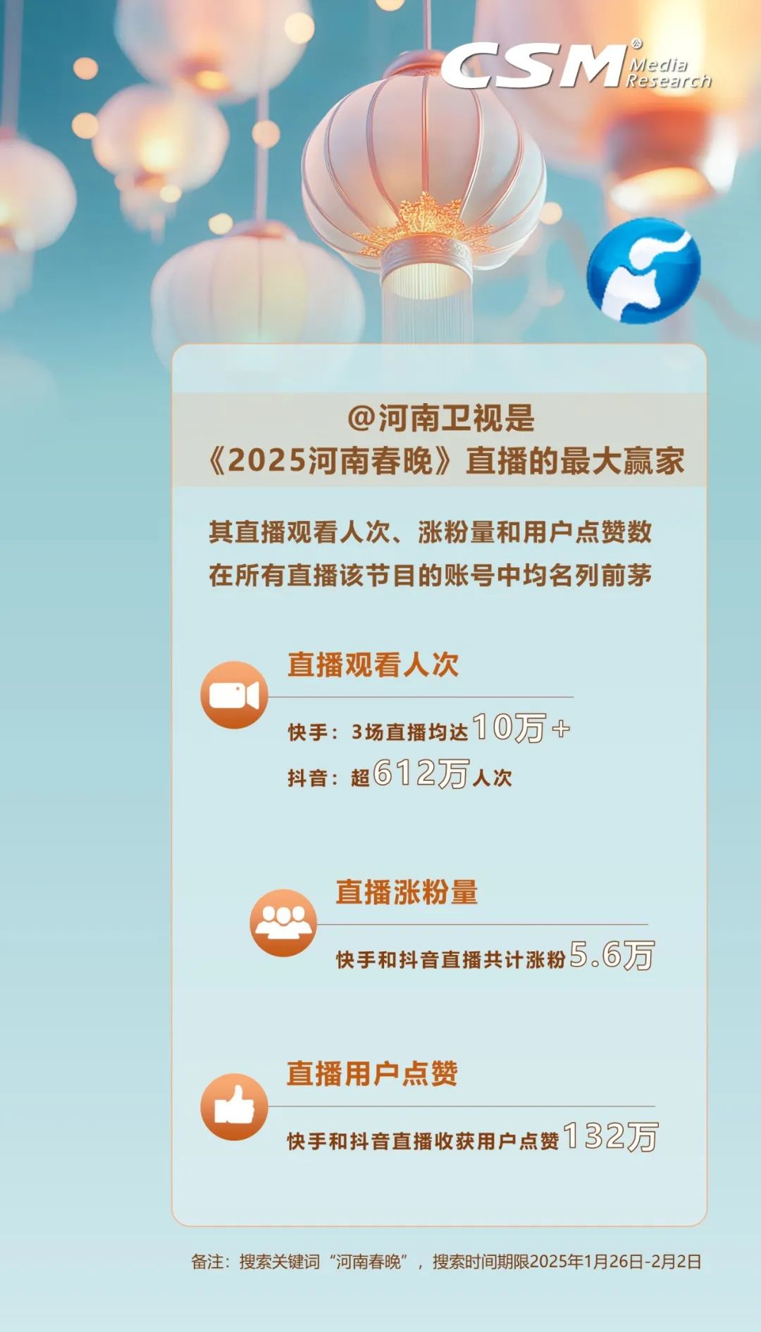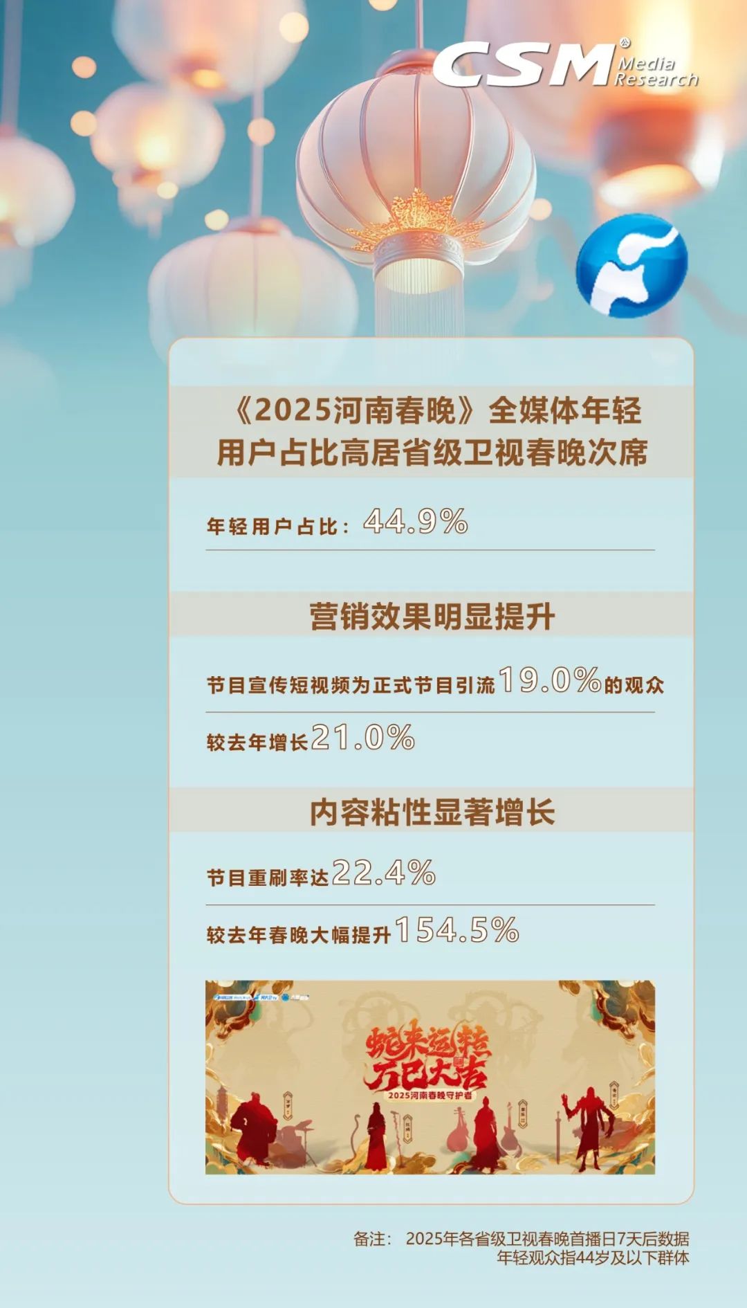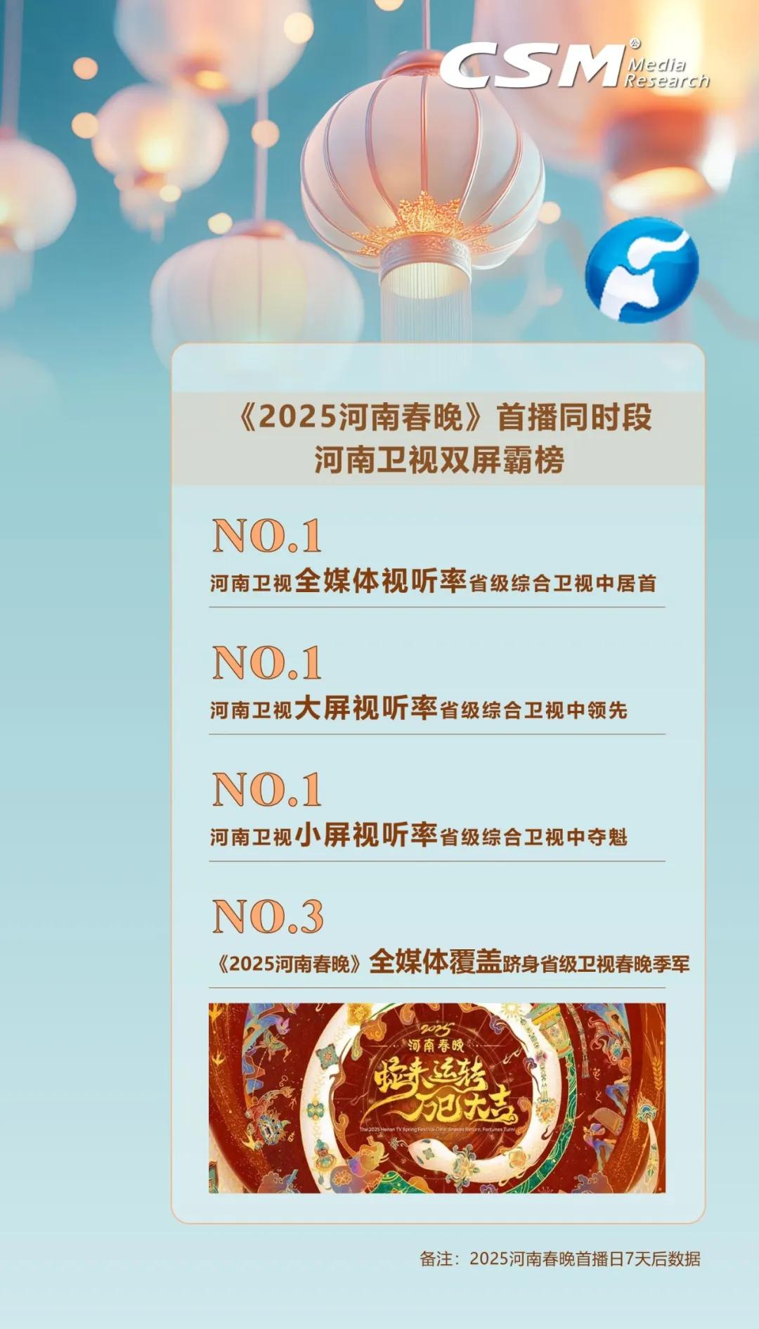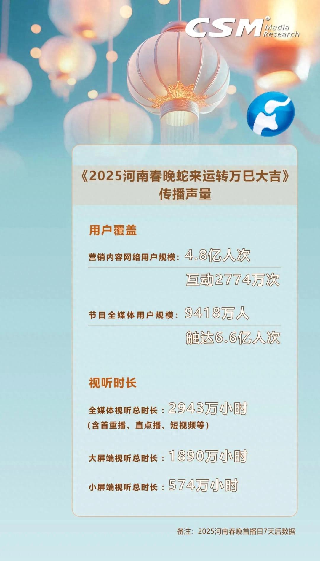《2025河南春晚》緊扣“傳統(tǒng)煥新”內(nèi)核,再度憑借破圈影響力點燃全網(wǎng)。據(jù)CSM全媒體數(shù)據(jù)顯示,節(jié)目首播后7天全媒體視聽總時長達2943萬小時,觸達用戶達6.6億人次!2025河南春晚》首播同時段河南衛(wèi)視在省級衛(wèi)視中全媒體視聽率、大屏與小屏視聽率,一舉斬獲“三榜奪魁”的佳績;在省級衛(wèi)視春晚的排名中,《2025河南春晚》全媒體覆蓋躋身季軍之位,用數(shù)據(jù)展現(xiàn)其在文化傳播方面的出色表現(xiàn) 。