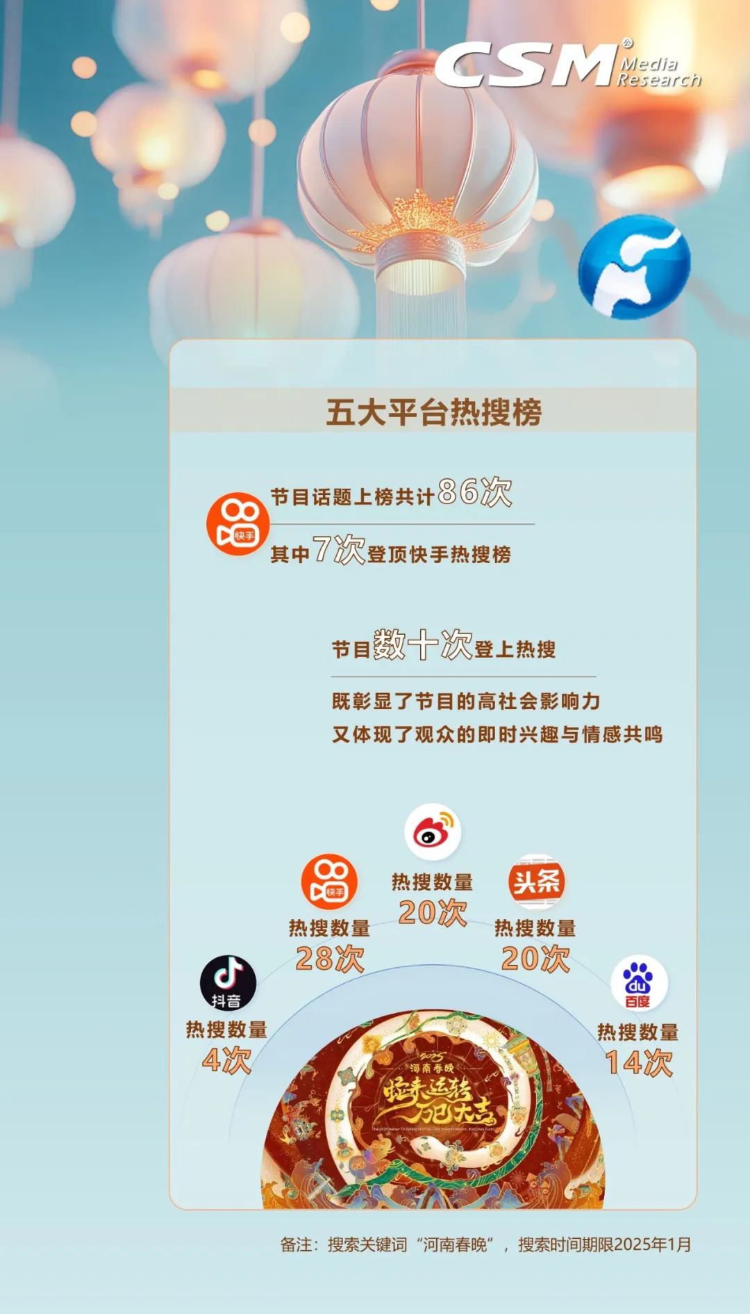 2025河南春晚全網(wǎng)熱搜累計上榜86次,其中快手平臺7次登頂熱搜榜榜首?缙脚_的聯(lián)動營銷,吸引超百萬用戶參與。此外,2024年12月7日,新媒體賬號在多個平臺發(fā)布了“2025河南春晚吉祥守護者概念圖”的春晚預(yù)告,當天即有超20萬人關(guān)注,逾3.7萬人互動,為節(jié)目預(yù)熱打下了良好基礎(chǔ)。