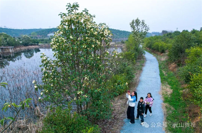 “今天星期天,媽媽帶我來油茶園看白蘭花。白蘭花又白又香,真好看啊。”光山實驗小學一年級學生馬峻照也開心地分享了他的感受。