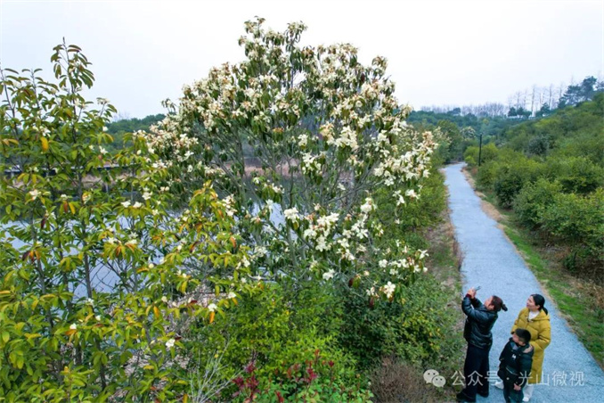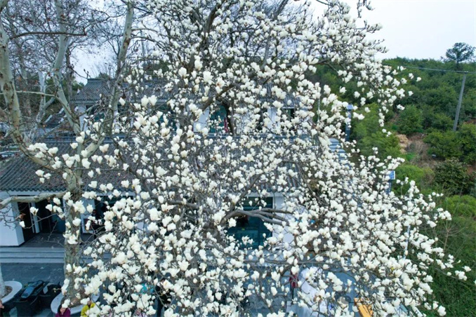 據(jù)悉,白蘭茶舍院內(nèi)的兩棵玉蘭樹栽植于上世紀60年代末,樹齡已超過50年,平均樹高約11米,冠幅約4.5米,是園區(qū)的“元老級”景觀。2022年,司馬光油茶園景區(qū)將原槐店鄉(xiāng)晏崗村林場的護林房改建為白蘭茶舍,為游客提供游玩、觀景、賞花的休憩場所。同時,茶舍周邊的道路和水塘旁也栽植了新的玉蘭樹,經(jīng)過幾年的生長,今年這些玉蘭樹進入盛花期,成為園區(qū)的新亮點。