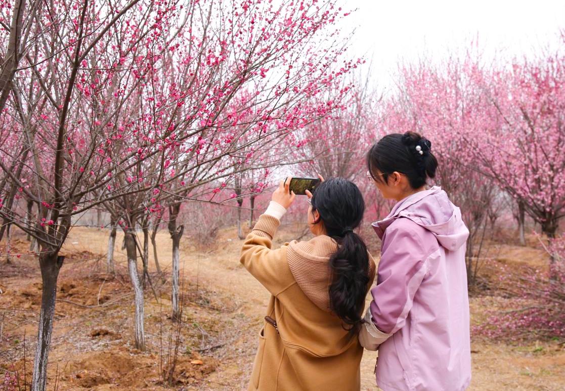 梅花怒放,引得游客紛至沓來,老人們漫步其間,悠然自得,時光在這一刻變得緩慢而溫柔;孩子們花海中追逐嬉戲,歡聲笑語為多彩梅林增添無限生機(jī)。人們舉起手機(jī)、相機(jī),用心捕捉著這靈動美妙的瞬間;文藝青年們則在梅林中歌唱、吟詩,在梅香國融入藝術(shù)的芬芳,為這片花海增添了一抹藝術(shù)色彩。