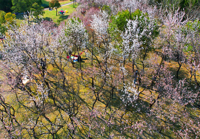 鄭州之林內(nèi)的紫葉李花開正艷。