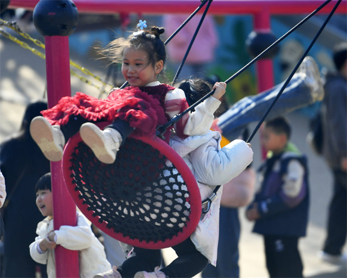 3月16日,鄭州天氣晴好,公園廣場(chǎng)花紅柳綠,很多市民帶著孩子在戶外踏青游玩。