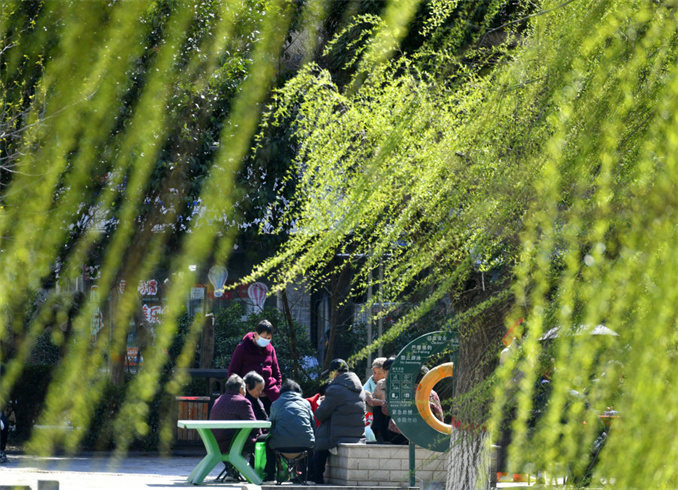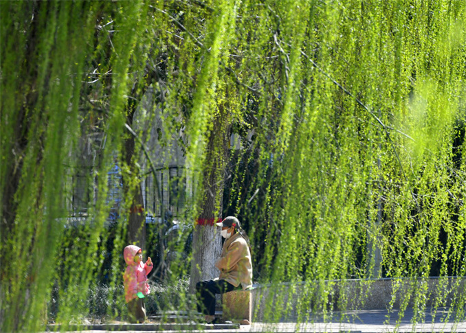 熊耳河濱河公園內(nèi),市民在垂柳樹下“遛娃”。
