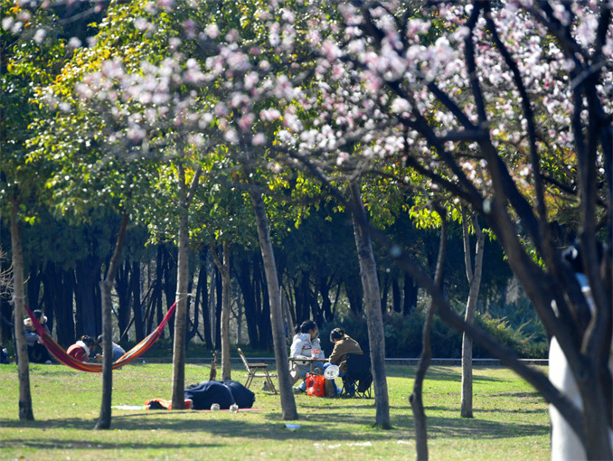 鄭州之林公園內(nèi),市民在草坪上休閑。