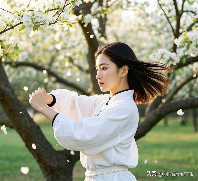 梨花樹下,武術(shù)表演拳腳生風(fēng),帶起簌簌花瓣。