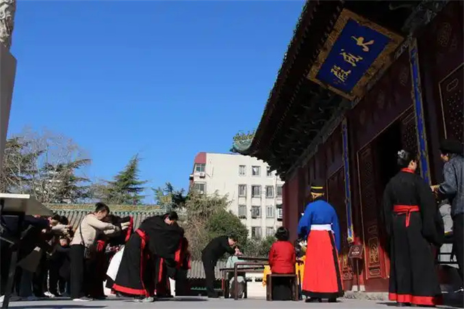 春分時(shí)節(jié),萬物復(fù)蘇,天地和合,正是“祭先賢、習(xí)禮儀”的良辰。上午8時(shí)許,參與者身著漢服,在司儀引導(dǎo)下有序步入文廟;顒右郧f重的祭拜儀式拉開序幕,凈手、獻(xiàn)花、誦讀祭文等古禮環(huán)節(jié)一一呈現(xiàn),參與者手持卷軸,齊聲誦讀《關(guān)雎》《大學(xué)》經(jīng)典,瑯瑯書聲回蕩在文廟院落。