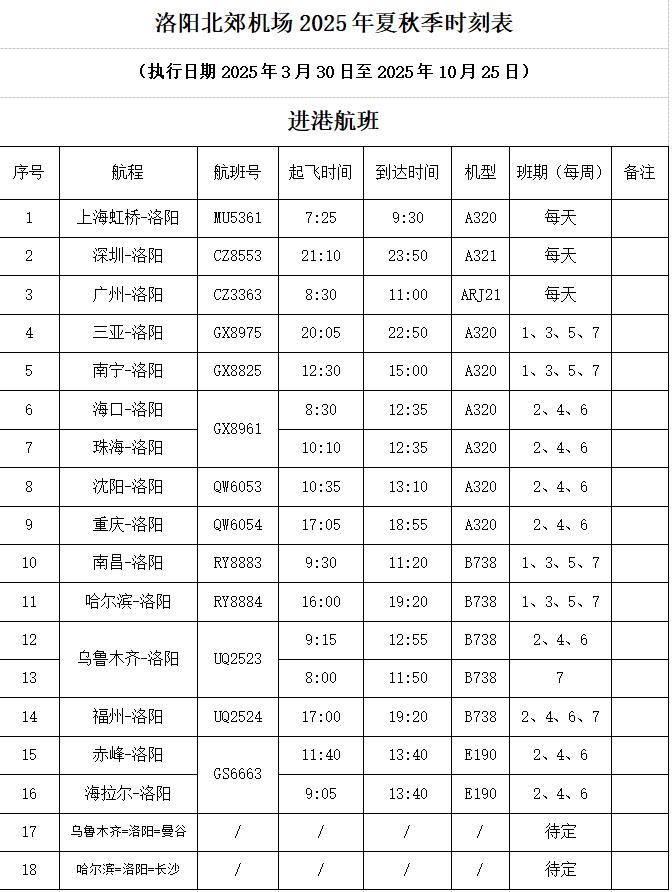 新的航班時(shí)刻表將執(zhí)行至2025年10月25日。洛陽(yáng)北郊機(jī)場(chǎng)工作人員提醒旅客,由于全國(guó)各地機(jī)場(chǎng)均將開(kāi)始執(zhí)行夏秋季航班計(jì)劃,因此乘機(jī)時(shí)請(qǐng)認(rèn)真核對(duì)出行航班、時(shí)刻、目的地機(jī)場(chǎng)等信息。