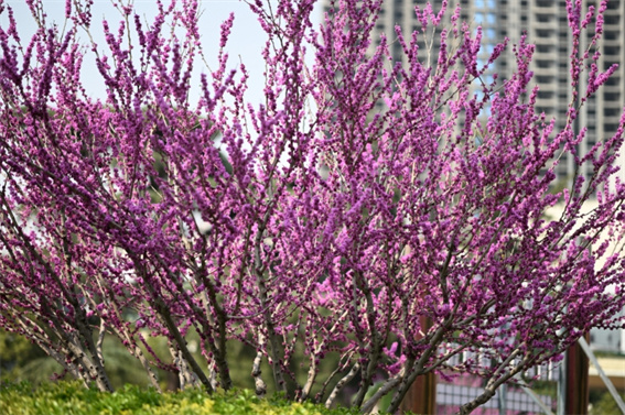 風(fēng)吹紫荊樹,色與春庭暮。柔情春三月,走進(jìn)紫荊山公園,滿滿的浪漫氣息撲面而來。園區(qū)內(nèi)種植的本地紫荊、紅花紫荊、白花紫荊、加拿大紫葉紫荊、黃山紫荊、垂枝紫荊、湖北紫荊、巨紫荊、羊蹄甲、金葉紫荊10個(gè)品種共計(jì)7000余株,如施粉黛霞披,競(jìng)相綻放,滿枝嫣紅,近看似火,遠(yuǎn)望如霞。