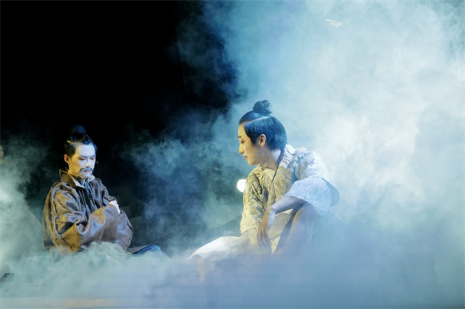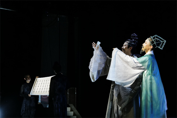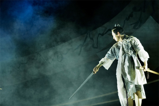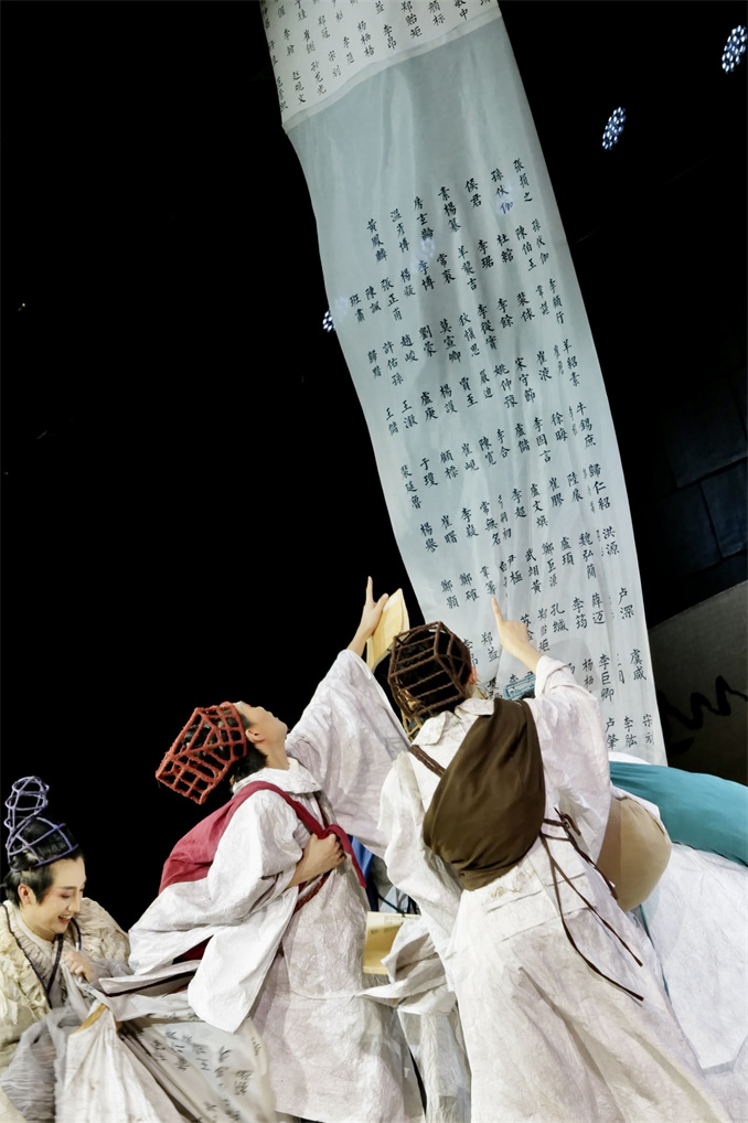 在舞臺(tái)設(shè)計(jì)上,該劇采用詩(shī)意化表達(dá),如將《蜀道難》詩(shī)句轉(zhuǎn)化為褶皺紙質(zhì)服飾,配合空靈詩(shī)樂(lè)、寫(xiě)意燈光及多媒體光影,構(gòu)建虛實(shí)交錯(cuò)的東方美學(xué)空間,同時(shí)創(chuàng)新運(yùn)用“人物偶”象征角色生命力,也為觀眾營(yíng)造了一個(gè)沉浸式的觀劇體驗(yàn)。