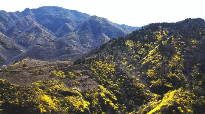 遠眺山野,金黃色的花海從淺山丘陵向深谷延展,千山染金、燦若云霞;近觀枝頭,簇簇黃花綴滿柔韌枝條,隨風搖曳,淡雅香氣氤氳山谷。