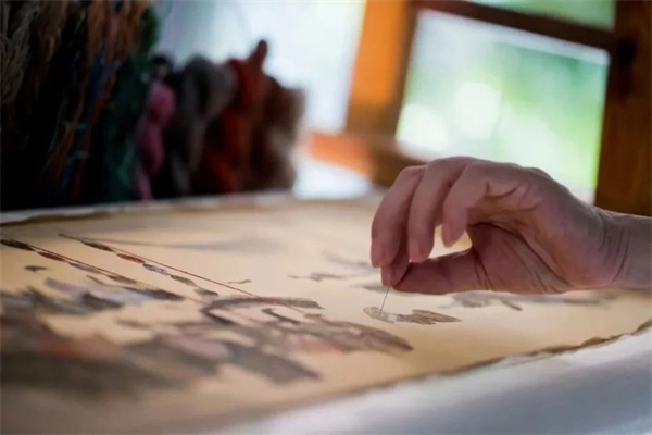 汴繡源于宋代宮廷繡,繡工精致細膩、色彩古樸典雅、層次分明、形象逼真,擅長繡制古畫、花鳥人物。融合了中國傳統(tǒng)藝術(shù)的多元元素,既有宮廷歷史的宏大描繪,也有自然風(fēng)光的細膩刻畫。
