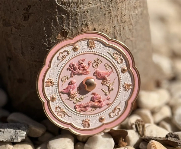 完美復(fù)刻開封博物館雙龍雙鳳銅鏡,以宋式配色美學(xué)的雅致,特調(diào)出符合春夏季節(jié)的桃夭色和杏花色為主色,搭配點睛的玫瑰金和一縷綠色增加層次感。采用浮雕技術(shù)刻畫紋飾,以人魚姬色點綴雙龍雙鳳,細閃工藝使鏡身色彩豐富,浪漫淡雅。使用磨砂工藝提升手觸質(zhì)感,使整體畫面變得高級。