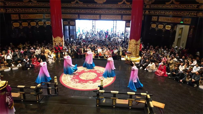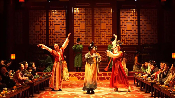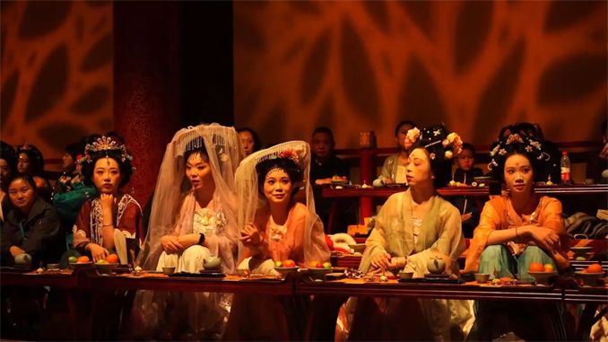 在河南洛陽(yáng)隋唐洛陽(yáng)城《唐宮樂(lè)宴》現(xiàn)場(chǎng),游客扮演文武百官進(jìn)宮赴宴,沉浸式體驗(yàn)大唐的服章之美、歌舞之妙、人物風(fēng)流。