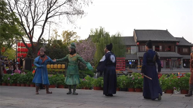 在洛邑古城,園區(qū)內(nèi)的互動(dòng)活動(dòng)趣味十足。游客在游玩過(guò)程中會(huì)遇到月老、武則天、胡人牽駝等各類(lèi)NPC,讓游客深度融入古城的江湖故事,感受濃厚的市井氣息。