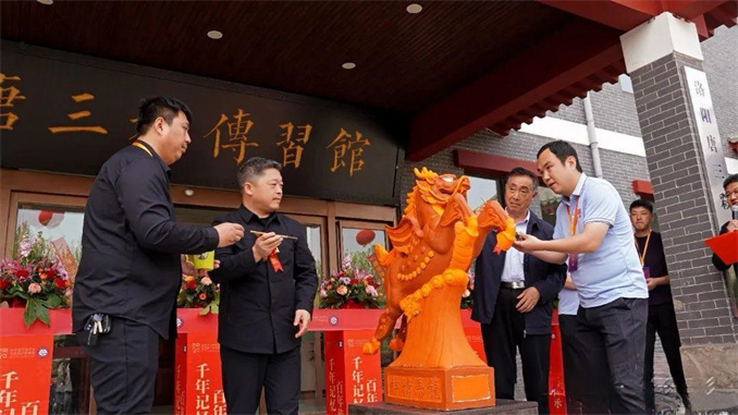 河洛文化生態(tài)保護發(fā)展中心主任王麗娟對傳習(xí)館的開業(yè)送上祝賀,并對唐三彩燒制技藝的傳承與發(fā)展前景寄予厚望。洛陽市文化廣電和旅游局黨組書記、局長李振刊宣布開館。隨后,中國陶瓷工藝協(xié)會副理事長、河南陶瓷玻璃行業(yè)管理協(xié)會會長楊德林和李振刊共同為唐三彩素胎“龍馬精神”作品進行“畫龍點睛”,一舉將活動推向了高潮。