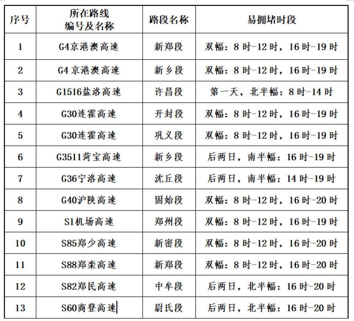 預測可能出現(xiàn)擁堵的路段有:機場高速鄭州段、京港澳高速新鄭段、京港澳高速新鄉(xiāng)段、連霍高速開封段、鄭少高速新密段、鄭民高速中牟段等。