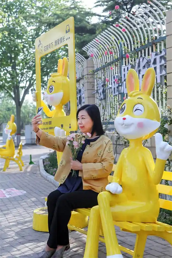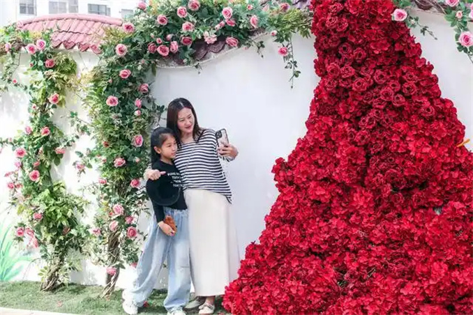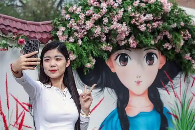 4月26日,在博愛(ài)縣清化鎮(zhèn)街道八街清怡苑東路,市民在網(wǎng)紅墻前打卡拍照。